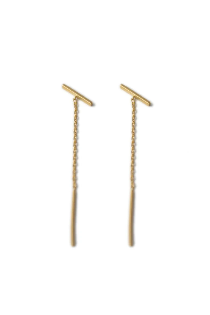 a hint of sparkle. crafted from a delicate chain that is gold-plate over brass, these threaders are topped off with a skinny bar post that sits snugly at your ear lobe while the rest dangles down the rear. a great every day earring.
