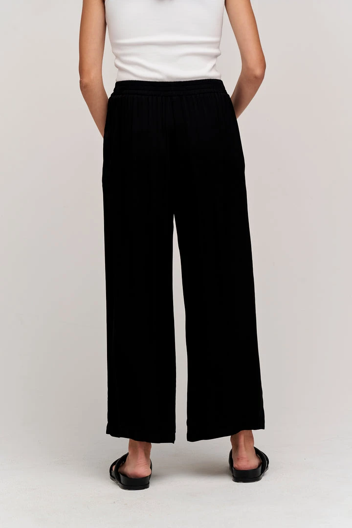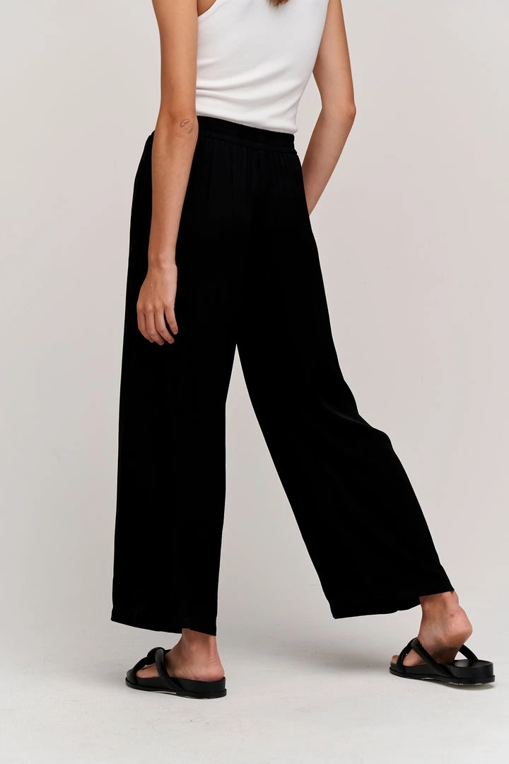 A shortcut to holiday dressing with this satin woven trouser that delivers a subtle sheen. Featuring an elegant simplicity with an elastic waist and wide leg that crops perfectly at the ankle.