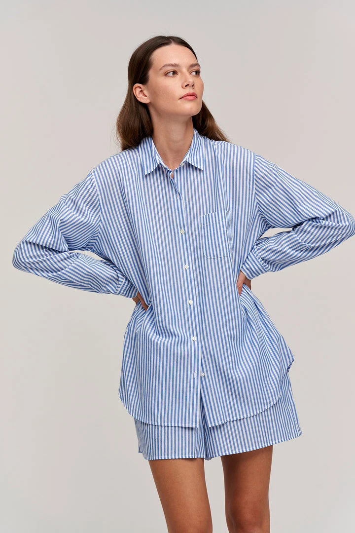 Few pieces are more timeless than menswear-inspired button up in a blue and white ticking stripe. With a few design tweaks—straight yet relaxed fit and a smaller cuff—this is the most versatile top of the season.