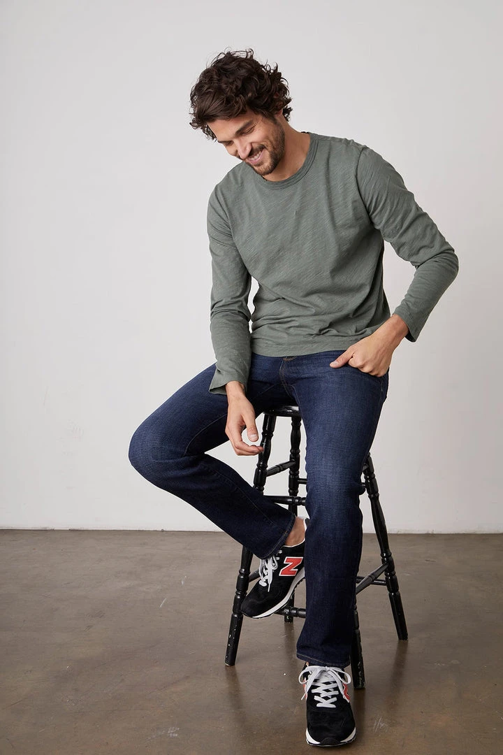 A true slub knit, with its soft vintage-feel texture. A failsafe layering piece with a flawless fit and a subtle curve at the hemline so it hangs perfectly over jeans or shorts.